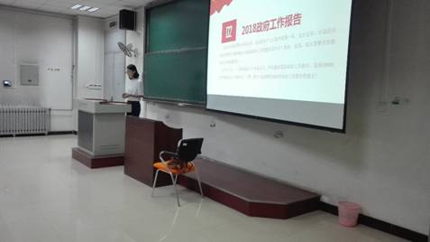 会上付媛媛同学言简意赅地介绍了习近平总书记在北大的讲话和政府工作报告的主要内容,同学们都认真听讲学习,深入了解了党的政治工作走向和习近平总书记对师生学习工作的期望和要求。
