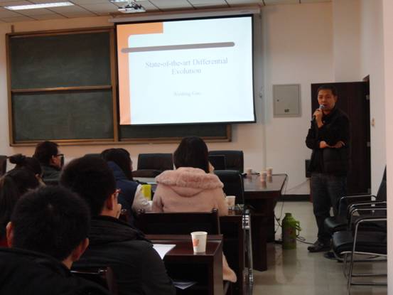 下午15:00,会议正式开始,在主持人简单介绍后,陈明徕首先作了题为“T-S模糊双曲正切基于模型的非线性系统的非脆弱保性能控制”的精彩报告,他简要介绍了非线性系统性能控制方面的研究现状以及自己的研究方向,然后就自己的研究内容作了详细的说明。接着高卫峰博士作了题为“State-of-art Differential Evolution”的报告,高卫峰博士是数学系优秀博士生,他对于Differential Evolution有特别先进的研究。最后优秀青年教师李伟老师作了非线性随机动力学方面的介绍。在问答环节大家都积极提问,整个会议过程气氛非常活跃。