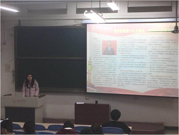 常老师从大学生要学习贯彻19大报告精神出发,跟同学们一起学习十九大报告中一系列新思想、新论断、新提法、新举措,常老师就报告中切实增强学习贯彻习近平新时代中国特色社会主义思想的政治自觉、思想自觉和行动自觉,把思想和行动统一到习近平新时代中国特色社会主义思想上来,她倡导同学们宣传好党的十九大精神,听党话跟党走,以实际行动贯彻落实党的十九大精神,凝聚起同心共筑中国梦的磅礴力量。