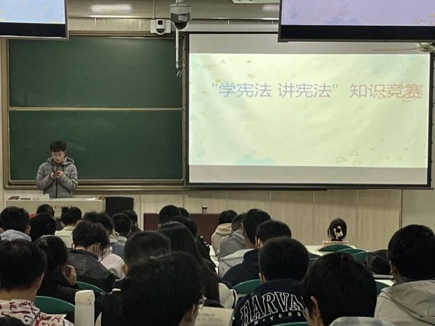 本次宪法知识竞赛答题分为三个环节,第一环节为单选题共20题。每小题倒计时30秒,由队伍代表举起ABCD牌子之一代表本队答案,由计分员统计正确答案,答对记1分。第二环节为多选题一共10题。每小题倒计时30秒,全答对记3分答错或答不全则无分。第三环节为判断题,抢答环节,共10题。以起立为准,起立最快的队伍代表为抢答者。答对记5分。答错扣3分。活动现场氛围活跃,同学们积极踊跃参与答题活动。在答题的过程中,主持人为同学们讲解每道题的内容,同学们既复习了已知的宪法内容,又学习到新的宪法知识。