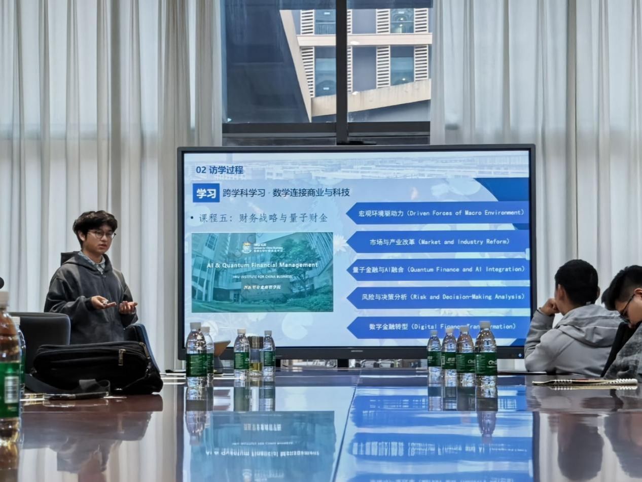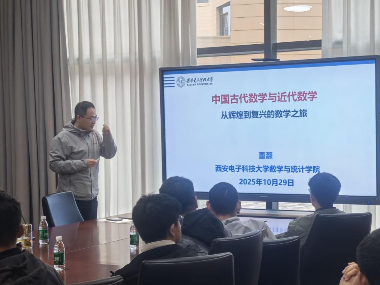 随后,董灏教授带来了题为“中国古代数学与近代数学,从辉煌到复兴的数学之旅”的报告,为同学们筑牢数学自信。他从古人对数字的表达逻辑切入,用生动的案例展现了中国古代数学的智慧与独特魅力,还细致分析了中国古代数学的核心特点、与西方数学的差异,以及自成体系的方法论。报告中,他重点讲述了中国计算数学学派的崛起与成就,最后为同学们清晰指明了数学学习的方向,寄予了深切期望。大三优秀学长尹得锟也分享了暑假期间赴香港大学访学的宝贵经历。他介绍,此次访学聚焦数学与金融等跨学科主题,采用“理论讲授——案例分析——小组展示——人文参访”的立体化模式,不仅让他收获满满,也深度体验了香港的独特文化。学长从课程学习、科研交流、文化适应三个维度,细致分享了自己的访学感悟:既介绍了香港高校浓厚的学术氛围和高效的学习方法,也给新生们提供了参与校外交流项目的实用建议,让大家对“如何利用资源提升自己”有了更具体的认知。